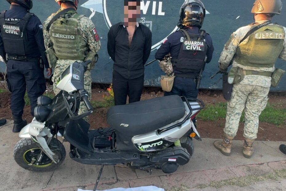 Al patrullar sobre una brecha de terracería en la colonia Villas del Oriente, elementos de la Guardia Civil y del Ejército Mexicano localizaron al ahora detenido de 26 años a bordo de una motocicleta, a quien le marcaron el alto para efectuarle una inspección.