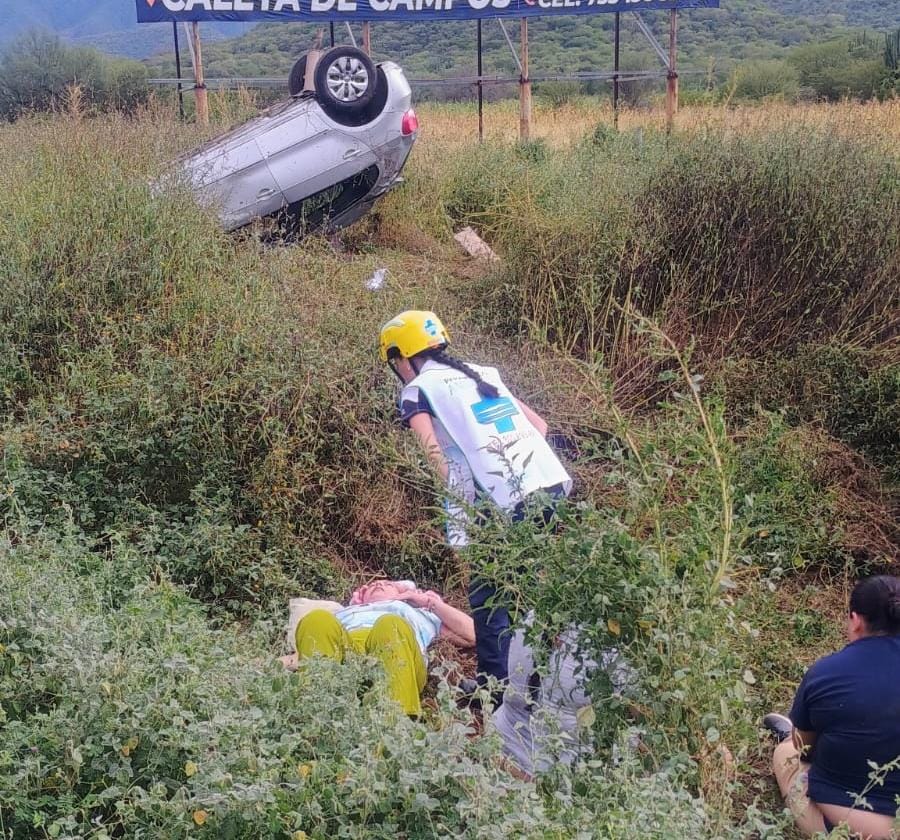 El primer percance ocurrió a la altura del kilómetro 194+500, en el tramo Las Cañas-Lázaro Cárdenas, donde un Volkswagen Gol gris salió del camino y terminó volcado fuera de la cinta asfáltica. El personal de AMBUMED acudió al lugar y atendió a tres personas heridas, entre ellas Rufina S., de 58 años de edad, originaria de Timbinal, Guerrero, quien presentó traumatismo craneoencefálico, herida sangrante y dolor intenso en cuello y el tórax. Debido a la gravedad de sus lesiones, fue trasladada a un hospital en Nueva Italia para recibir atención médica especializada.