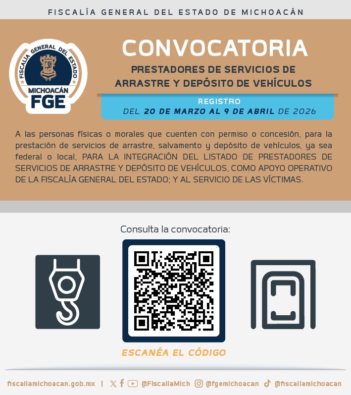 Con el propósito de fortalecer su capacidad operativa y garantizar servicios eficientes, transparentes y alineados a la normatividad vigente, el Fiscal General del Estado, Carlos Torres Piña, emitió la convocatoria pública para la integración del listado de prestadores de servicios de arrastre, salvamento y depósito de vehículos.