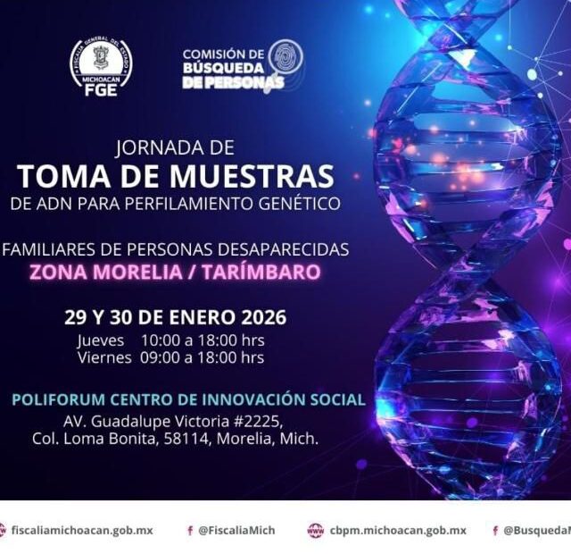La Fiscalía General del Estado de Michoacán (FGE), a través de la Fiscalía Especializada en Desaparición Forzada y Desaparición Cometida por Particulares, invita a la ciudadanía a participar en la 1ª Jornada de Toma de Muestras de ADN, que se llevará a cabo los días 29 y 30 de enero.