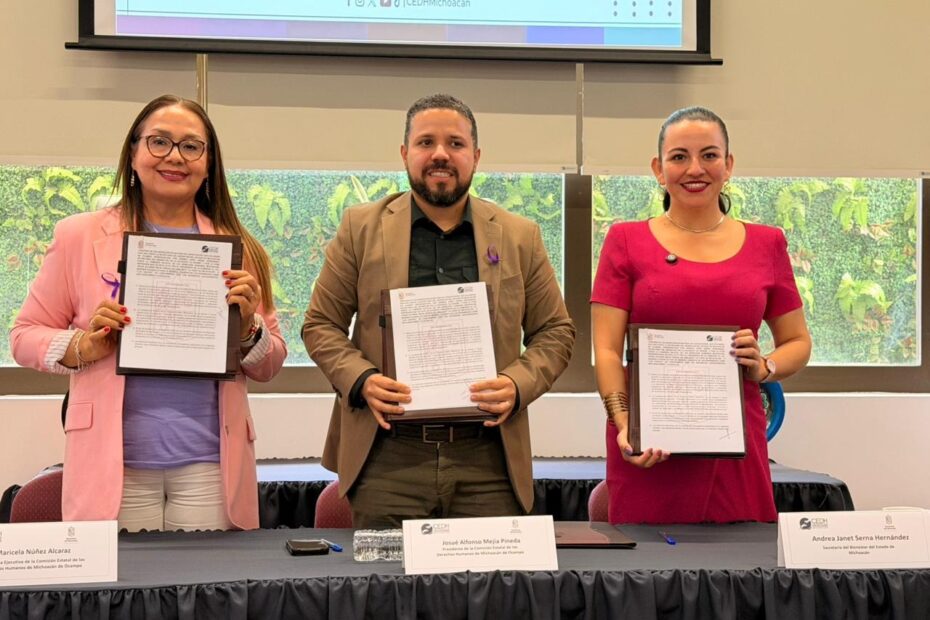 El presidente de la Comisión Estatal de los Derechos Humanos de Michoacán, Josué Alfonso Mejía Pineda y la secretaria del Bienestar del Gobierno de Michoacán (SEDEBI), Andrea Janet Serna Hernández, signaron un convenio de colaboración con el objetivo de formalizar el trabajo coordinado que han venido realizando a favor de la ciudadanía michoacana.