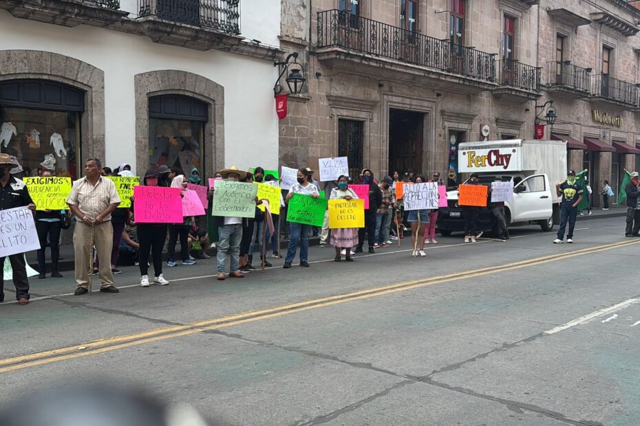 Integrantes del Frente Nacional de Lucha por el Socialismo (FNLS) protestaron este jueves afuera del Congreso del Estado de Michoacán mientras los diputados sesionaban al interior del recinto. El grupo bloqueó la avenida Madero a la altura de Pino Suárez, colocó una manta en la fachada del edificio legislativo y portó banderas de su movimiento.