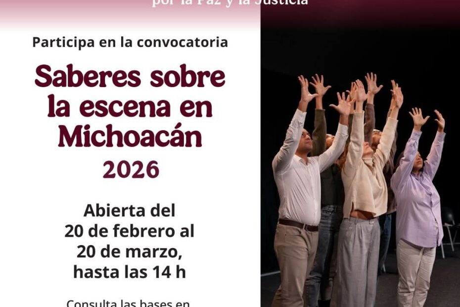 *Morelia, Michoacán, 18 de marzo de 2026.-* La convocatoria “Saberes sobre la escena en Michoacán”, dirigida a las y los creadores escénicos y a la comunidad artística del estado cierra el viernes 20 de marzo, informó la Secretaría de Cultura de Michoacán (Secum).