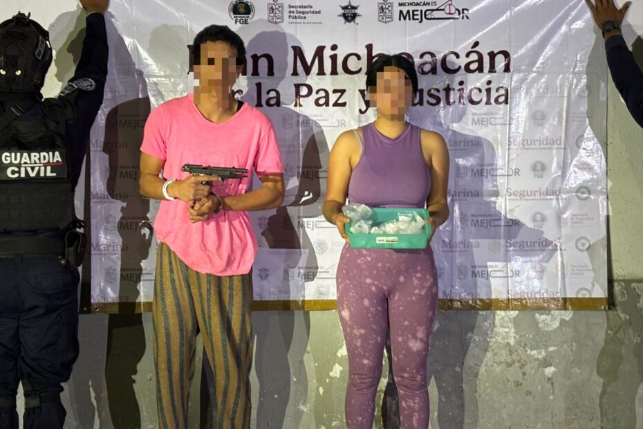 Uruapan, Mich.- 15 de enero de 2025.- Un hombre y una mujer que tenían en su poder varios gramos de droga sintética de la conocida como “crystal” listos para su venta y una pistola fueron detenidos la noche del pasado miércoles por elementos del Grupo Motorizado de la Guardia Civil.