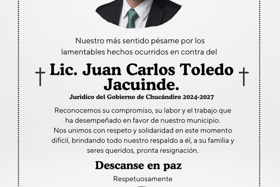 Juan Carlos Toledo Jacuinde, abogado de profesión, maestro y quien se desempeñaba como asesor jurídico del Ayuntamiento de Chucándiro, murió en el Hospital San Miguel, ubicado en la ciudad de Morelia, a consecuencia de las severas lesiones que sufrió tras ser brutalmente golpeado en el citado municipio, informaron autoridades policiales.