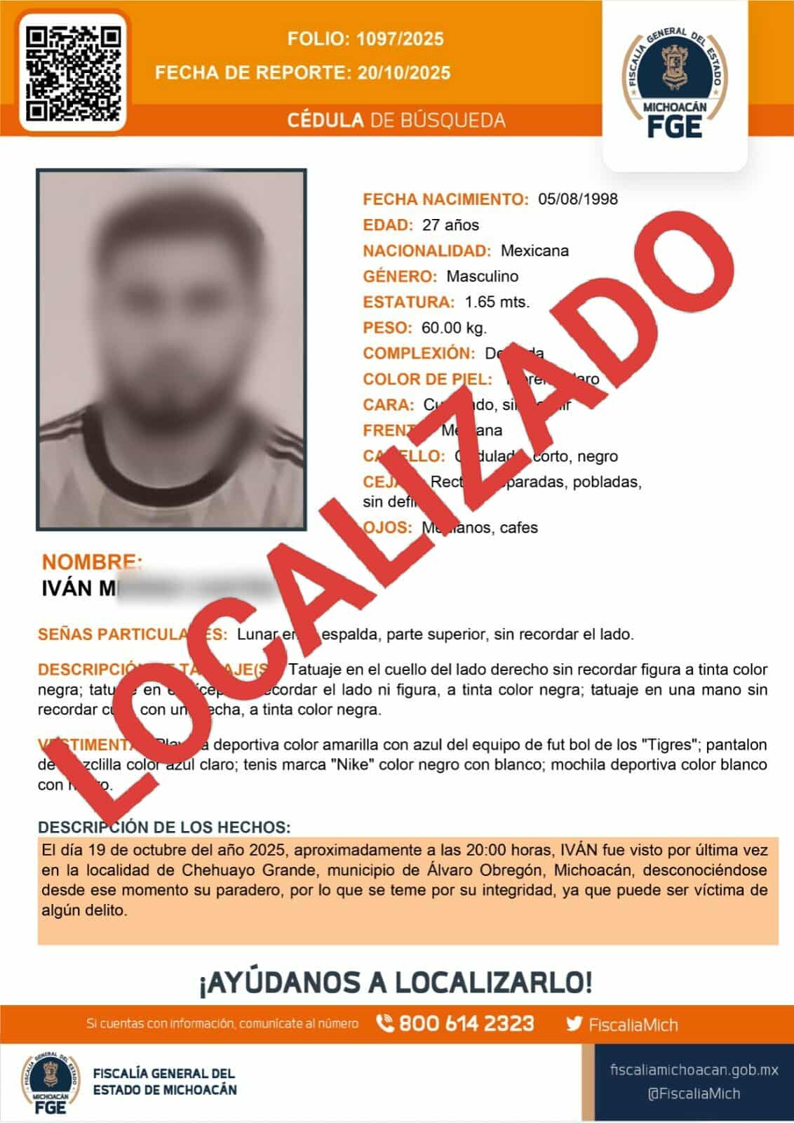 Al tener conocimiento del caso, los elementos de la Fiscalía General del Estado (FGE), adscritos al área de Personas Desparecidas, realizaron una búsqueda y recientemente encontraron a Iván sin vida dentro del referido caudal, a la altura de la comunidad de Las Trojes y a pocos metros del Puente Cuatro Caminos.