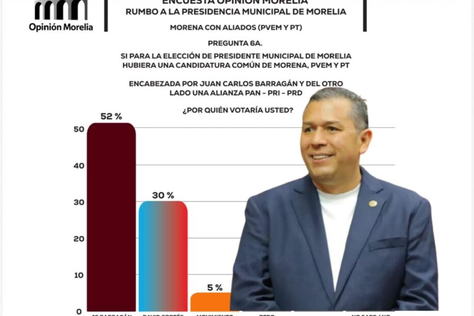 De acuerdo con la más reciente encuesta de Opinión Morelia, el diputado Juan Carlos Barragán se mantiene como el aspirante mejor posicionado dentro de Morena y con una ventaja clara frente a posibles contendientes de otros partidos.