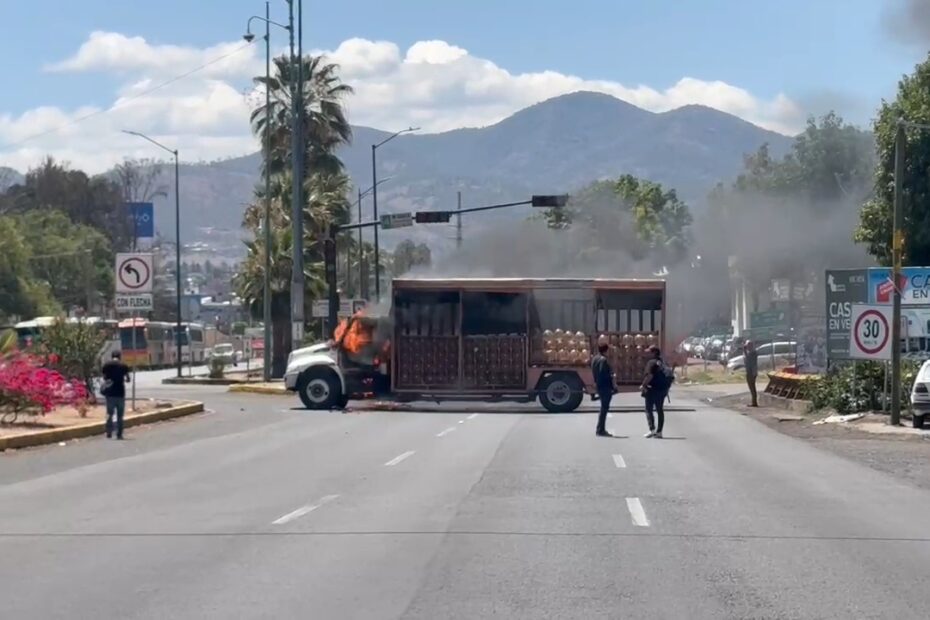 Morelia, Mich.- Lunes 06 de abril de 2026.- Un camión repartidor de agua fue incendiado por manifestantes de Arantepacua sobre el Libramiento Sur-Poniente de la ciudad de Morelia, justo frente a las instalaciones de la Fiscalía General del Estado (FGE), según trascendió durante la cobertura de la noticia.