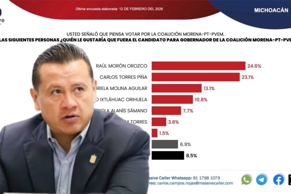 Morelia, Michoacán,16 de febrero de 2026,- La más reciente medición de la casa encuestadora Massive Caller, levantada el 12 de febrero de 2026 con mil entrevistas y un margen de error de ±3.4%, muestra que la coalición Morena–PT–PVEM se mantiene a la cabeza en la intención de voto rumbo a la elección de gubernatura de Michoacán en 2027, al tiempo que se consolida el crecimiento de Carlos Torres Piña en la preferencia para encabezar la candidatura.