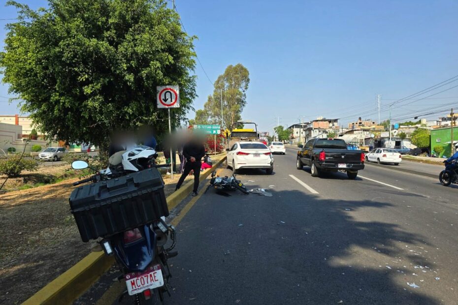 Morelia, Mich.- Martes 28 de marzo de 2026.- Un motociclista resultó lesionado tras chocar contra el costado derecho trasero de un automóvil sobre los carriles centrales del Libramiento Poniente de Morelia, informaron autoridades policiales.