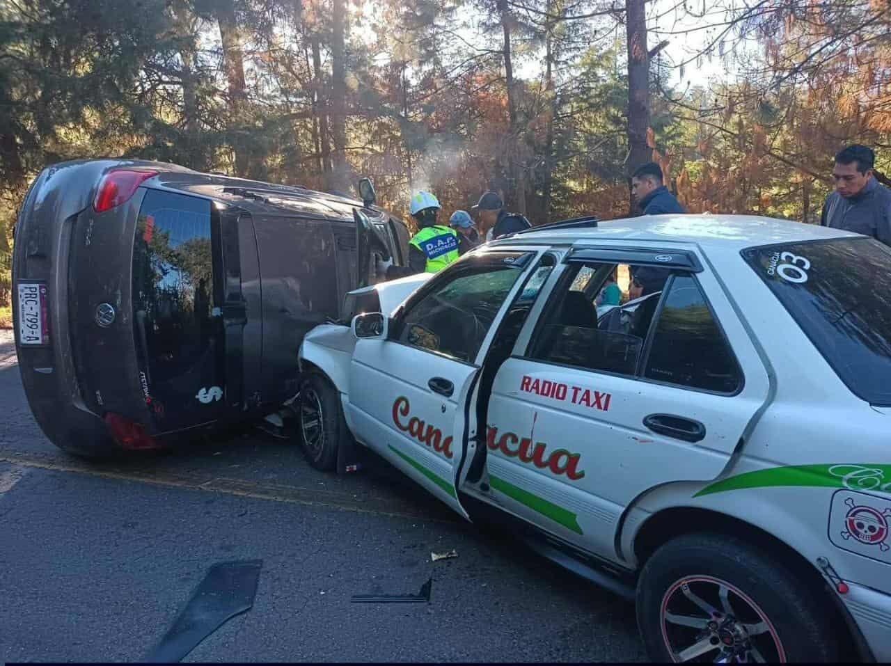 En el incidente estuvieron involucrados tres vehículos: un taxi Nissan Tsuru blanco con placa A662LBU, un Volkswagen Polo café con matrícula PRC799A —el cual terminó volcado—, y una camioneta Toyota Tacoma blanca con placa MT1855W.