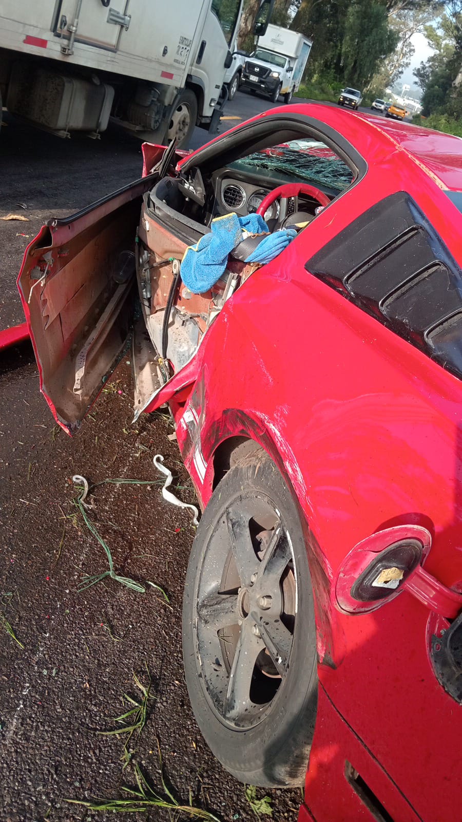 De acuerdo con los primeros reportes, el accidente tuvo lugar a la altura de la comunidad de Tacícuaro, donde un vehículo Ford Mustang GT de color rojo con franjas blancas, y matrícula PHY-223-A, tras chocar terminó sobre la carpeta asfáltica, con el frente destrozado.