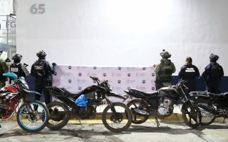 un chaleco táctico y cuatro motocicletas.