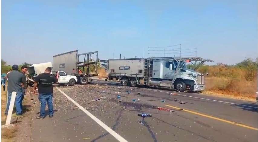 La otra unidad involucrada corresponde a un tractocamión tipo madrina, de color gris, con placas de circulación 08-FA-75. Ambos vehículos quedaron atravesados, bloqueando la circulación.