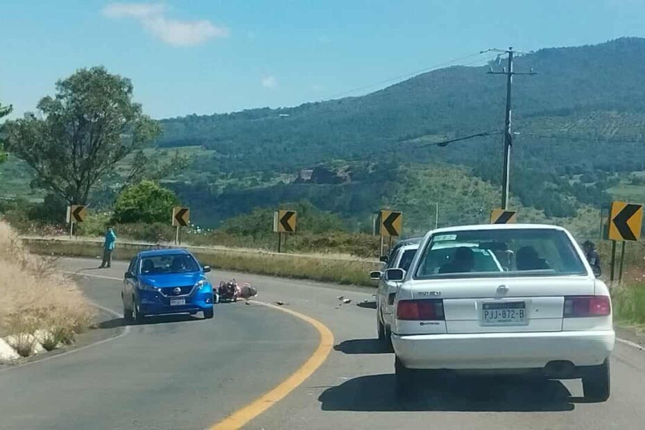 Morelia, Mich.- Martes 14 de octubre de 2025.- Un automóvil y una motocicleta protagonizaron un choque sobre la carretera Morelia-Quiroga, percance que dejó malherido al piloto del citado motociclo, comentaron fuentes allegadas al tema.