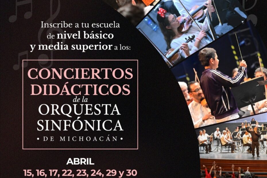 *Morelia, Michoacán, 23 de febrero de 2026.-* La Secretaría de Cultura de Michoacán (Secum) invita a instituciones educativas de nivel básico y medio superior a participar en los conciertos didácticos de la Primera Temporada 2026 de la Orquesta Sinfónica de Michoacán (Osidem), una propuesta formativa que acerca a niñas, niños y adolescentes a la experiencia de la música orquestal en vivo.