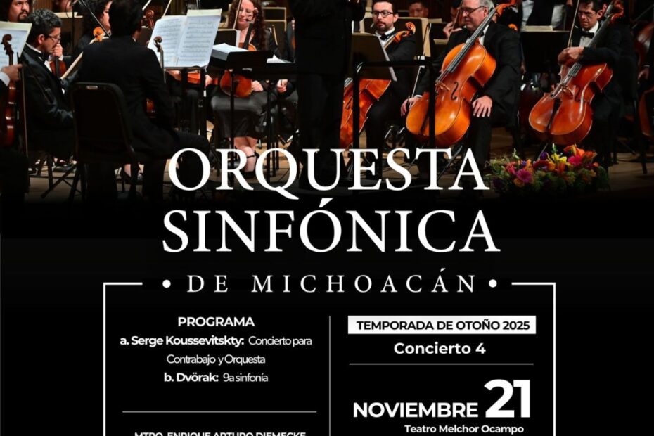 *Morelia, Michoacán, 18 de noviembre de 2025.-* La Secretaría de Cultura de Michoacán (Secum) invita al cuarto concierto de temporada de la Orquesta Sinfónica de Michoacán (Osidem) este viernes 21 de noviembre a las 19:30 horas en el Teatro Melchor Ocampo, con un programa que incluye el Concierto para Contrabajo y Orquesta de Serge Koussevitzky y la Novena Sinfonía de Antonín Dvořák, dos obras esenciales del repertorio sinfónico.