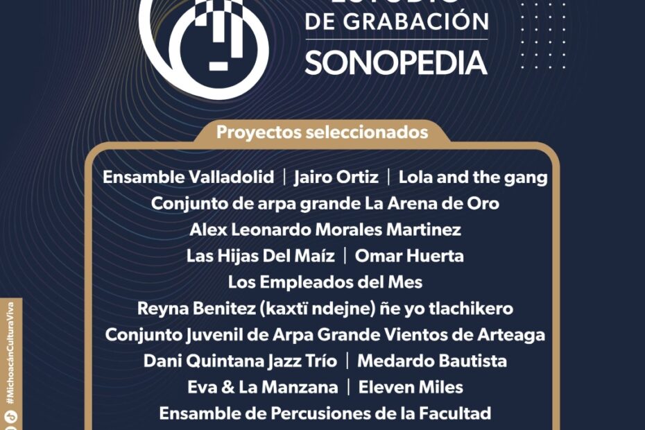 *Morelia, Michoacán, 25 de febrero de 2026.-* La Secretaría de Cultura de Michoacán (Secum) publicó los resultados de la segunda convocatoria de producción del estudio de grabación Sonopedia 2026, dirigida a fortalecer la creación, registro y profesionalización de proyectos musicales y sonoros en el estado.