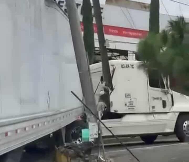 Morelia, Mich.- Un chofer de tráiler, al realizar maniobras para incorporarse de la calle Ignacio Aldama a la Avenida Periodismo, en Morelia, destrozó dos postes, uno de la Comisión Federal de Electricidad (CFE) y el otro de Telmex, además dañó la fachada de un negocio de ropa, trascendió en la cobertura de la noticia.