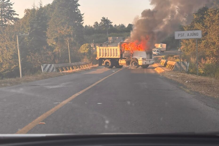 Trascendió que sobre la carretera Pátzcuaro-Uruapan, a la altura de la población de Ajuno, los delincuentes atravesaron un camión tipo volteo y lo quemaron.