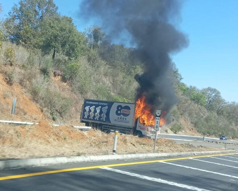 Pátzcuaro, Mich.- Lunes 06 de abril de 2026.- Un camión repartidor de la empresa Bimbo fue atravesado e incendiado sobre la autopista Siglo XXI, a la altura del kilómetro 50. Afortunadamente, solo hubo daños materiales, informaron fuentes policiales.