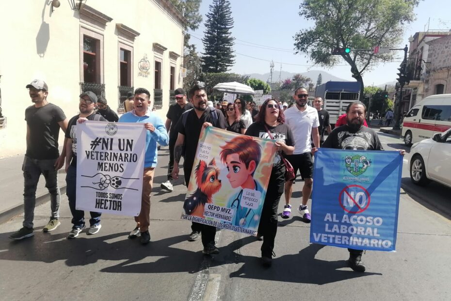 Médicos veterinarios marcharon este día en Morelia, para a exigir las autoridades y en especial a las y los integrantes del Congreso del Estado, penalizar a la difamación y brindar protección para el ejercicio de esta profesión luego de que un 18 de febrero de 2025, se diera el suicidio de uno de sus colegas tras ser víctima de una campaña de odio por el fallecimiento de una mascota.