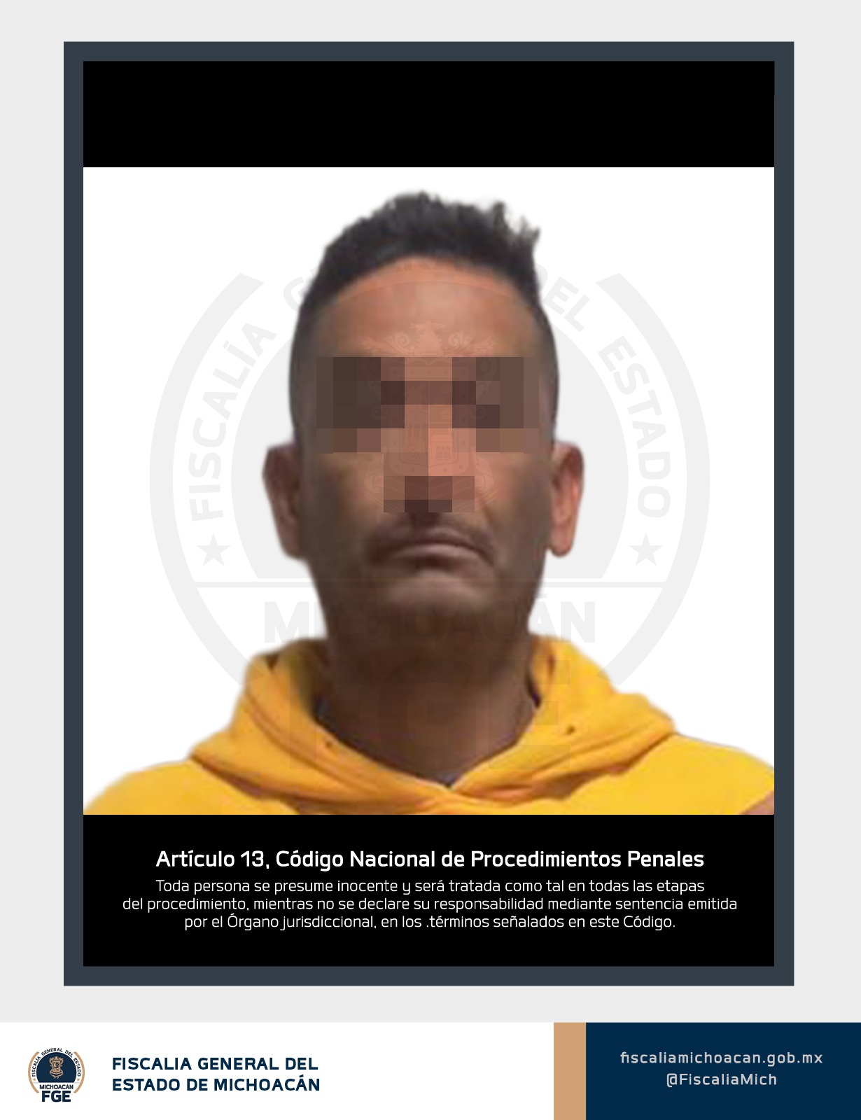 La Fiscalía General del Estado de Michoacán (FGE) obtuvo vinculación a proceso en contra de Óscar Arturo “N”, alias El Velador, por su probable responsabilidad en el delito de homicidio calificado, cometido en agravio de Luis Armando R., hechos ocurridos en este municipio.