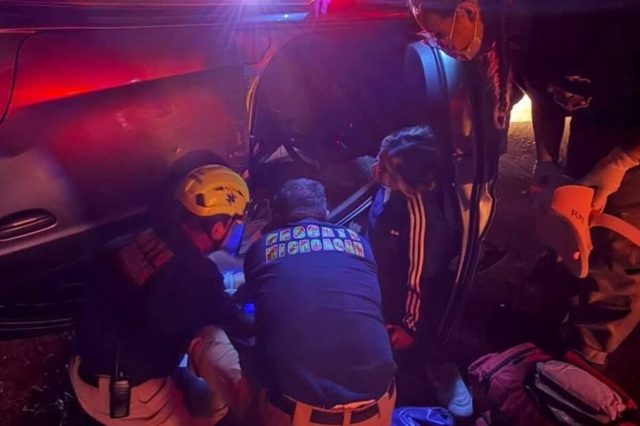 Uruapan, Mich.- 11 de marzo de 2026.- La noche del martes pasado se registró la volcadura de un vehículo compacto sobre la carretera Uruapan-Paracho, con saldo de una mujer embarazada lesionada y cuantiosos daños materiales.