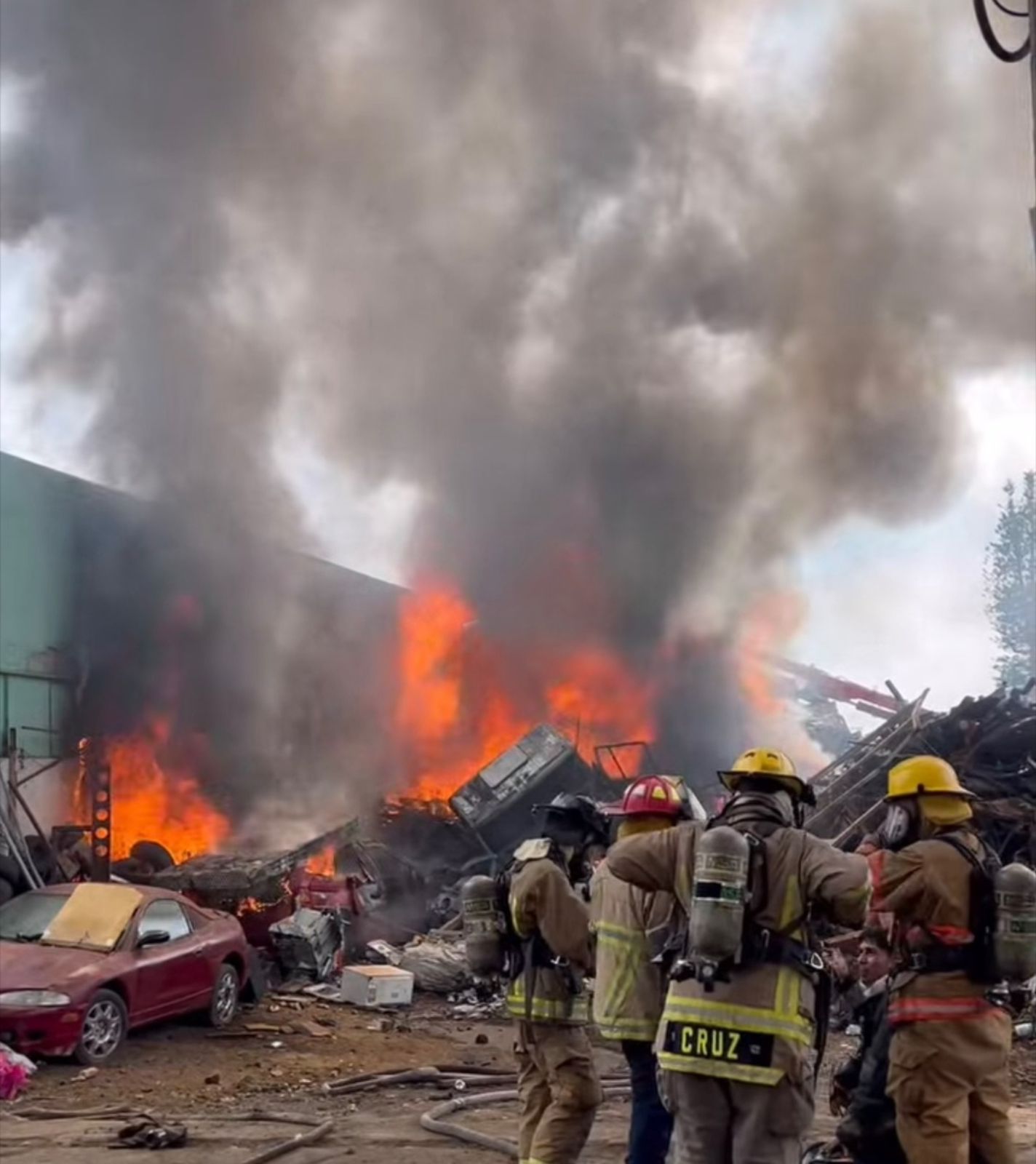 Uruapan, Mich.- 01 de diciembre de 2025.- Un voraz incendio en un almacén de chatarra registrado en el Fraccionamiento Lomas del Valle Sur de Uruapan, movilizó a elementos policiacos y Bomberos de distintas corporaciones; no se reportaron víctimas.