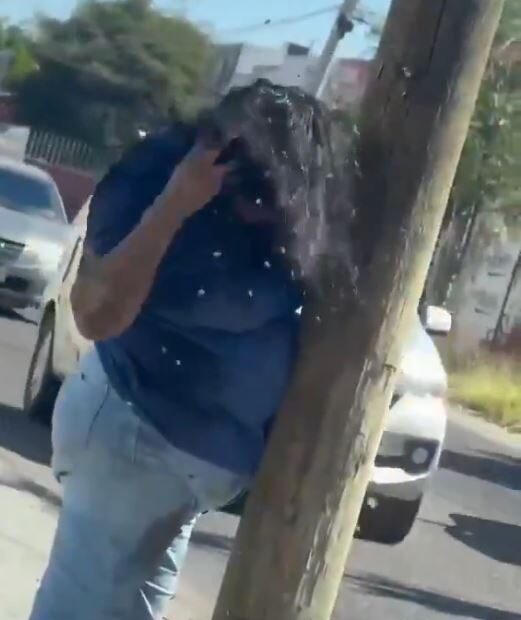En las imágenes del hecho, se observa a la mujer intentando resguardarse junto a un poste de madera, mientras decenas de abejas revolotean a su alrededor.