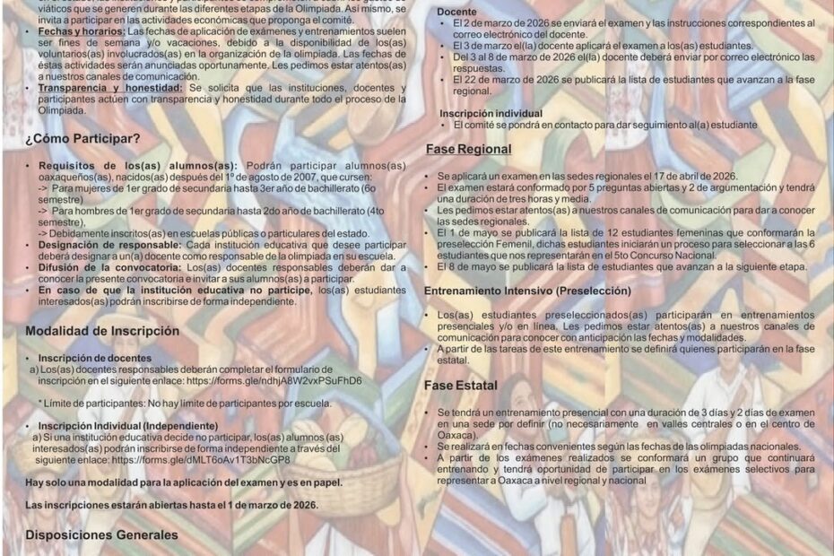 La convocatoria está dirigida a estudiantes de nivel básico y medio superior, así como a docentes interesados en acompañar y fortalecer la preparación académica. Además de seleccionar a quienes integrarán la delegación estatal que representará a Oaxaca en la etapa nacional, el programa tiene como meta consolidar una comunidad activa en torno a las matemáticas, promoviendo el intercambio de conocimientos y experiencias.