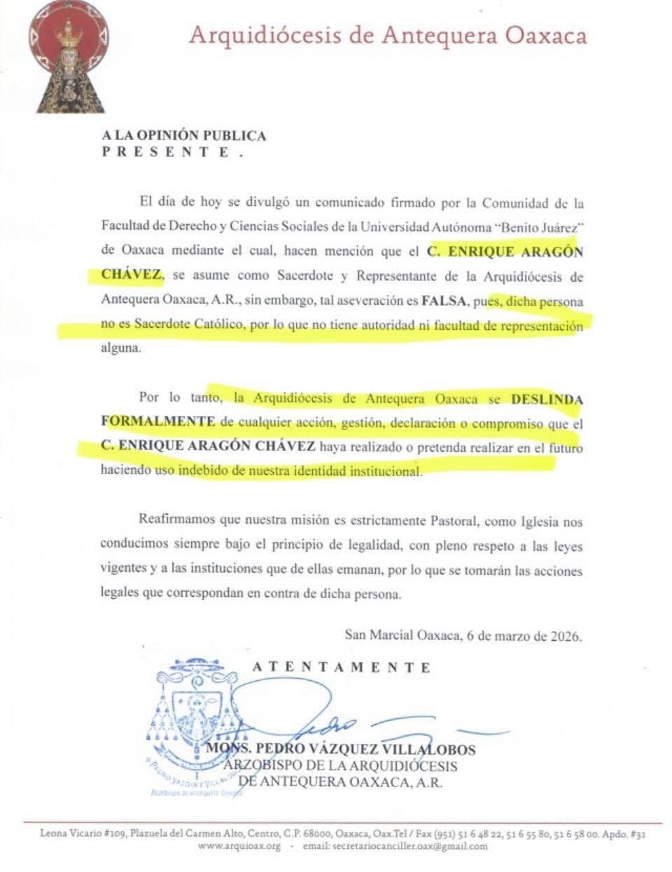 Por lo tanto, la Arquidiócesis de Antequera Oaxaca se deslindó formalmente de cualquier acción, gestión, declaración o compromiso que haya hecho Aragón Chávez o pretenda realizar en el futuro haciendo uso indebido de la institución eclesiástica.