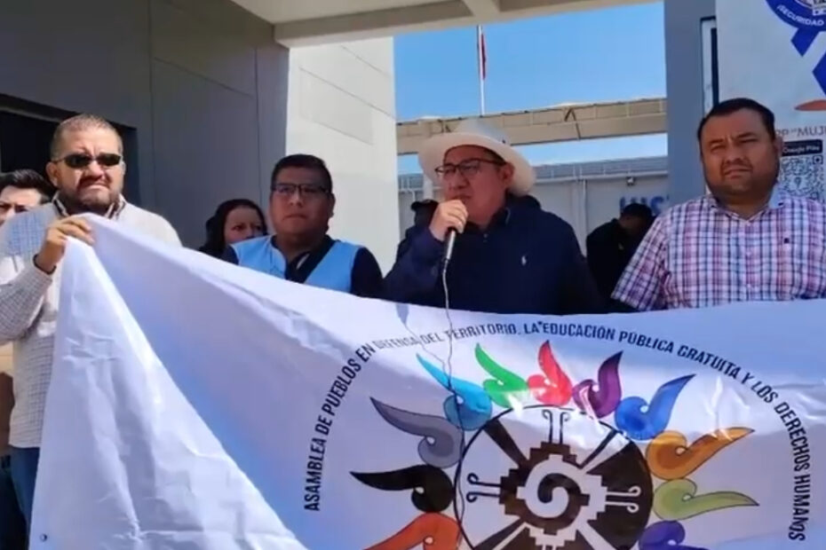 Un grupo de integrantes de la Asamblea del Pueblo en Defensa del Territorio protestaron en el cuartel general de la Policía Estatal, ubicado en Santa María Coyotepec, para denunciar la presunta agresión en la que incurrieron elementos contra sus militante.
