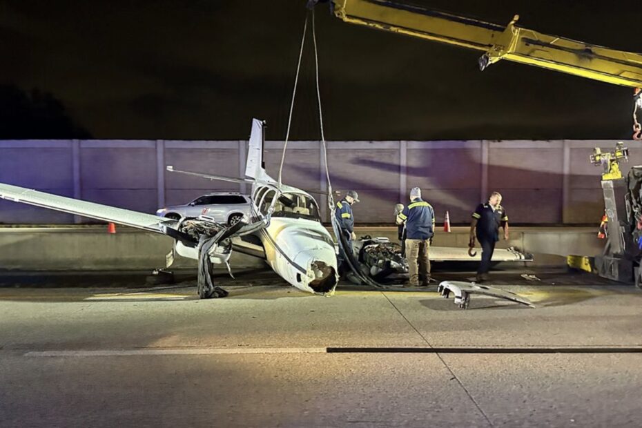 De acuerdo con los primeros informes, la avioneta descendió sobre los carriles sur de la autopista y cayó directamente sobre un sedán conducido por una mujer de 57 años, quien resultó con lesiones leves y fue trasladada a un hospital para su valoración médica. El piloto y un pasajero que viajaba con él salieron ilesos, aunque la aeronave registró daños severos tras el impacto.