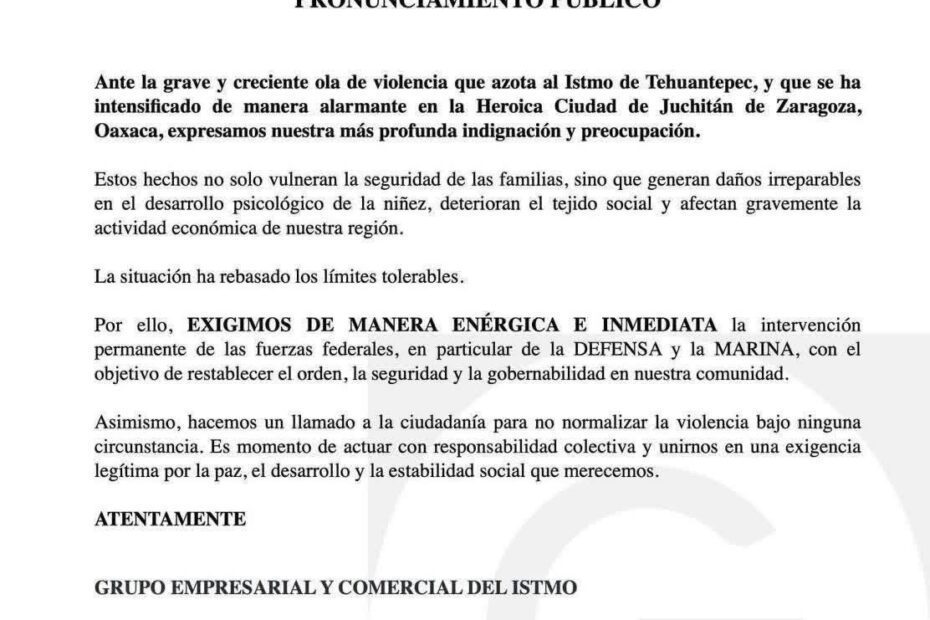 Ante la ola de violencia que azota a la región del Istmo de Tehuantepec y en particular municipios como Juchitán de Zaragoza, el Grupo Empresarial y Comercial del Istmo se han sumado en un llamado urgente al gobierno federal que preside Claudia Sheinbaum para la intervención permanente de las fuerzas federales en la región.