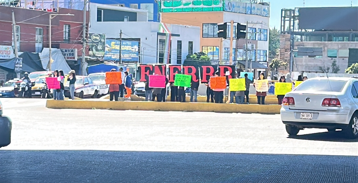 Integrantes de la Federación Nacional de Estudiantes Revolucionarios “Rafael Ramírez” (FNERRR) en Oaxaca realizaron una cadena humana en el crucero de 5 Señores para denunciar agresiones y represión que han sufrido en sus albergues o casas estudiantiles.