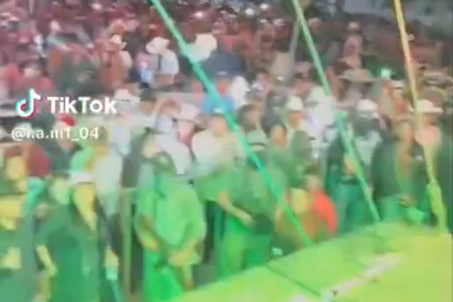 En las imágenes se observa que, debajo del escenario en el que toca un grupo musical, en el área de seguridad entre el escenario y el público, hay varias personas uniformadas, con pasamontañas y que portan armas largas.