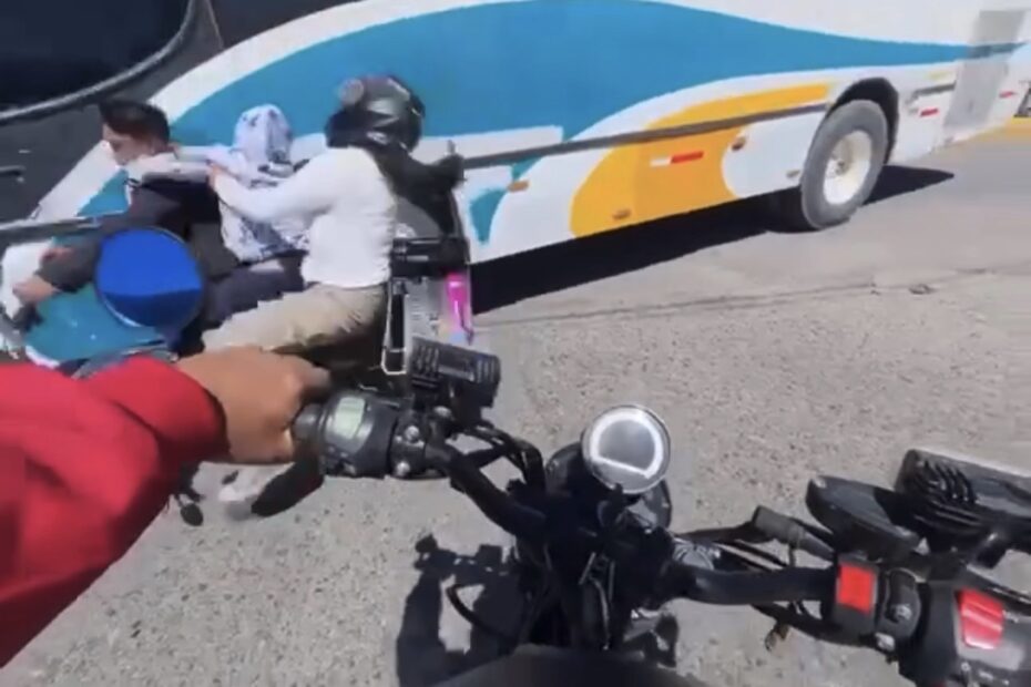 En la grabación que fue realizada por otro motociclista que viajaba detrás de los afectados, se pudo observar como dos personas que viajaba en una motoneta esperaron a que el autobús pasara, pero presuntamente, el chofer no realizó bien el cálculo y alcanzó a golpear en la parte frontal a los motociclistas.