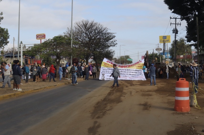 Habitantes de la agencia municipal de Pueblo Nuevo, bloquearon en las inmediaciones del crucero de Viguera para denunciar supuestas obras pluviales que aseguran están mal hechas.