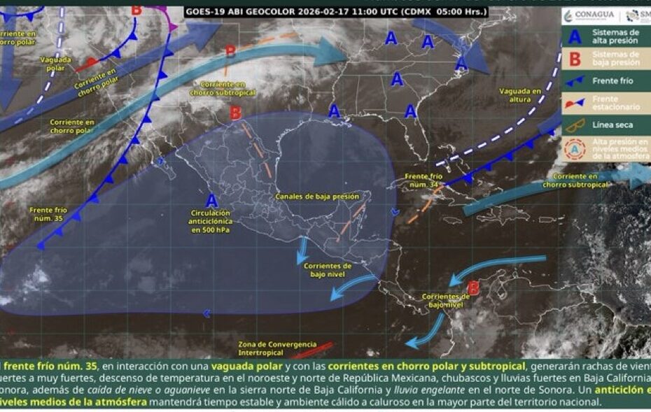 En contraste, el Frente Frío número 35 ocasionará precipitaciones intensas en Baja California, intervalos de chubascos en Sonora e incluso la probabilidad de caída de nieve o aguanieve en áreas montañosas del noroeste.