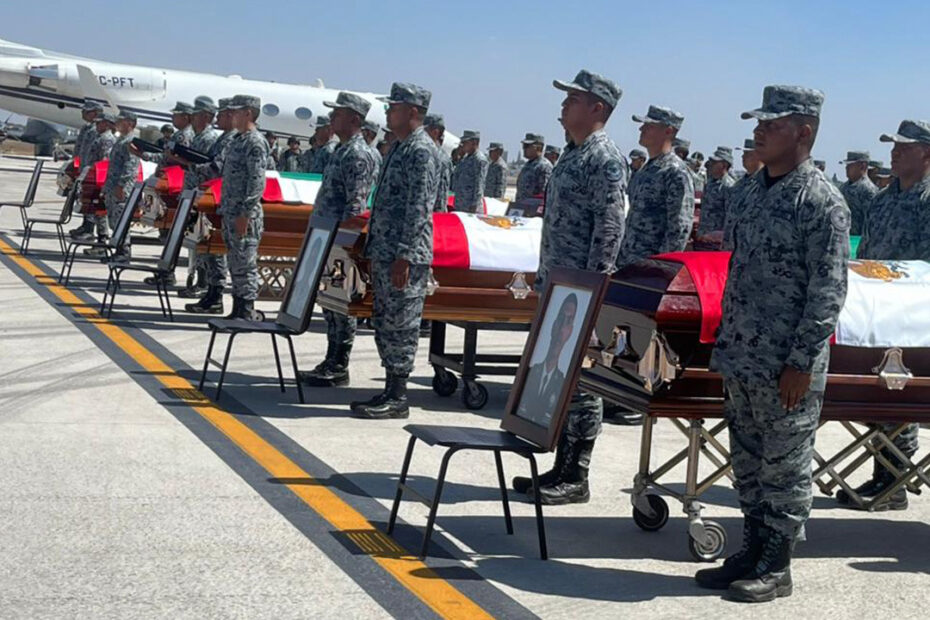 En la pista de la Base Aérea Militar Número 5, ubicada en Zapopan, los ataúdes fueron cubiertos con el lábaro patrio y acompañados por integrantes del Ejército. Durante los honores fúnebres se escuchó el toque solemne de la banda de guerra; además, frente a cada féretro se colocó la imagen de los uniformados caídos mientras se leían sus nombres y reseñas de vida.