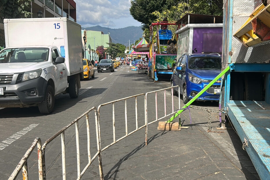 Varios de los puestos y los juegos mecánicos que se retiraron esperan la indicación para instalarse en la calle de Independencia en inmediaciones de la basílica de la Virgen de la Soledad, que se celebra el próximo 18 de diciembre.