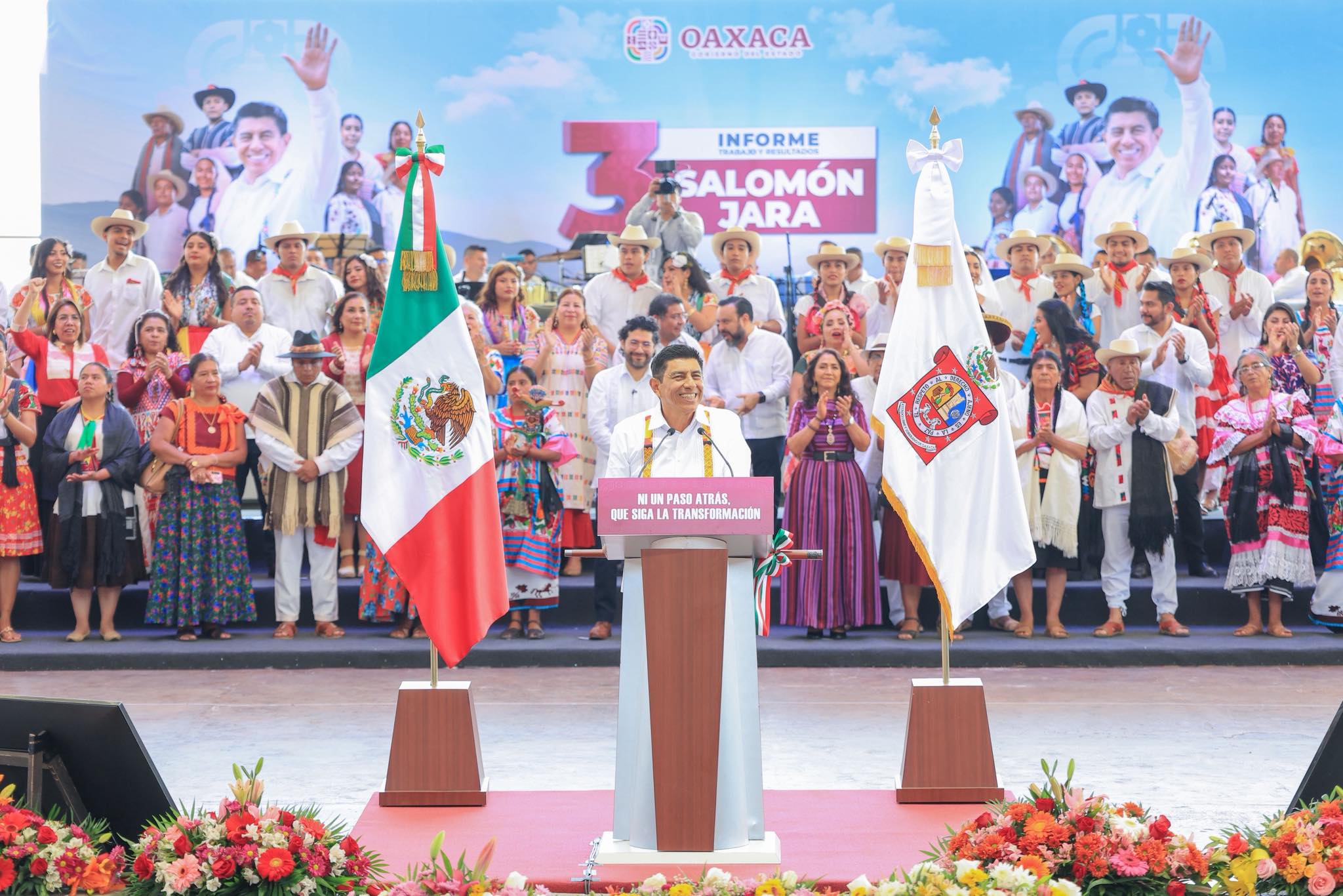 Con un Auditorio Guelaguetza a su máxima capacidad, el gobernador de Oaxaca, Salomón Jara Cruz, rindió su Tercer Informe de Trabajo y Resultados, en el que dio a conocer los principales avances y acciones emprendidas por su administración para impulsar el desarrollo integral del estado.