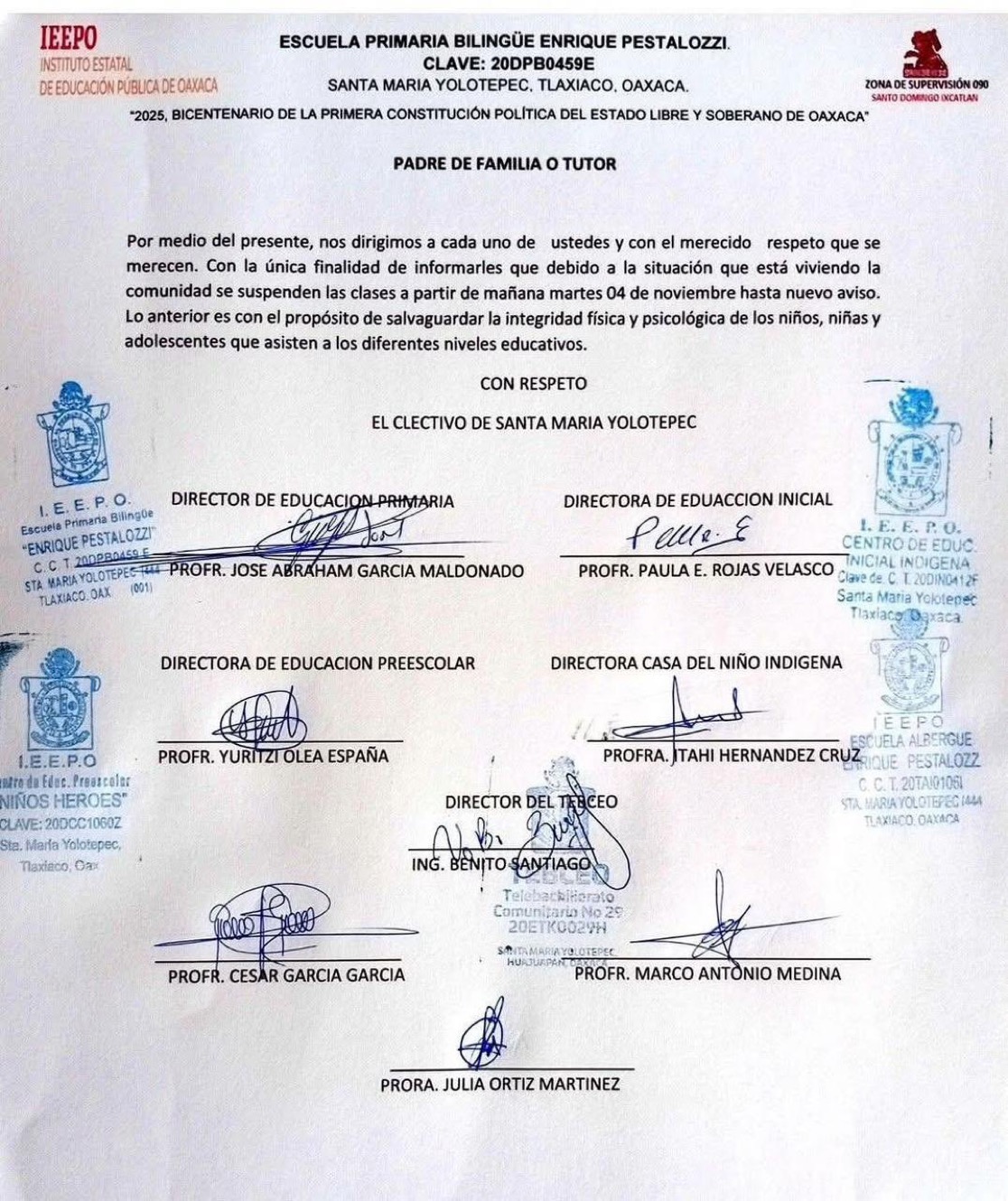 El oficio dirigido al IEEPO, fue firmado por directores y docentes de los diferentes niveles educativos y fue emitido por las instituciones de la comunidad, perteneciente a la zona de supervisión 090 de Santo Domingo Ixcatlán.