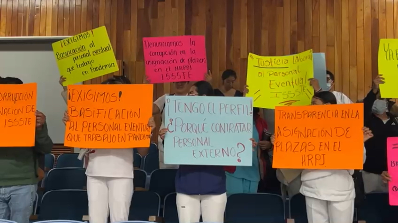 Personal de base y eventual, realizaron una protesta en el Hospital Regional “Presidente Juárez” del ISSSTE, para denunciar que la Sección 22 de la Coordinadora Nacional de Trabajadores de la Educación (CNTE), quiere imponer contratos con clave 70/71.
