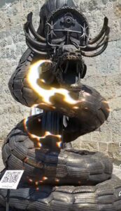 Para su elaboración se reutilizaron más de 200 llantas, lo que refleja el esfuerzo y la dedicación invertidos en la creación de una pieza minuciosamente trabajada, mediante técnicas de ensamblaje y reciclaje.