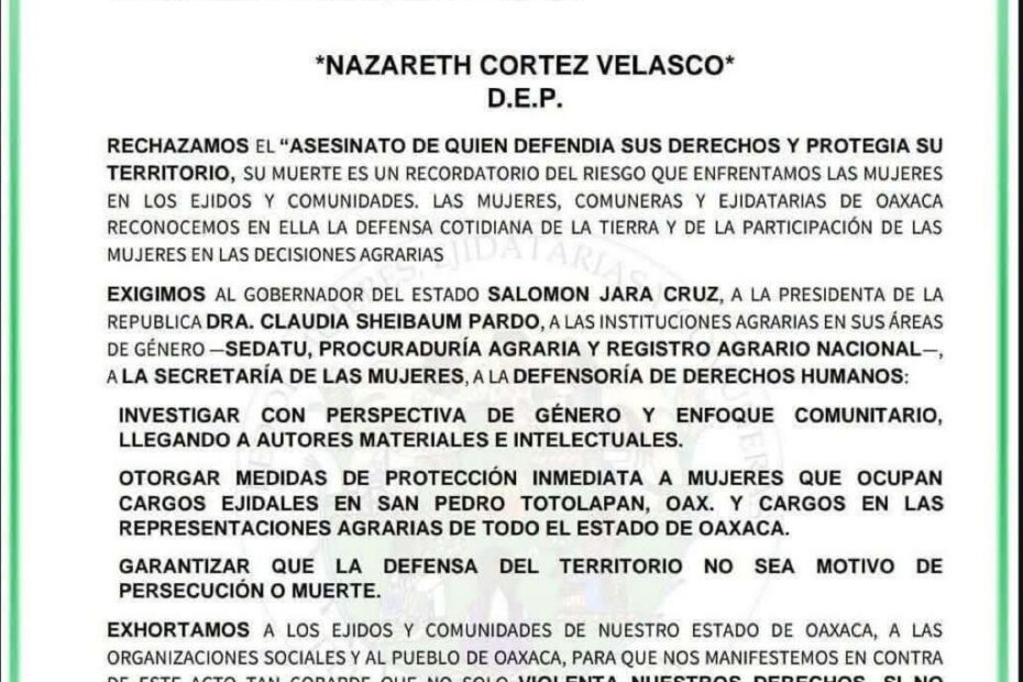 La Red de Mujeres Ejidatarias y Comuneras del Estado de Oaxaca hizo público un pronunciamiento para condenar el asesinato de Nazaret Cortés Velasco, quien se desempeñaba como presidenta del Comisariado Ejidal de San Pedro Totolápam, perteneciente al distrito de Tlacolula.