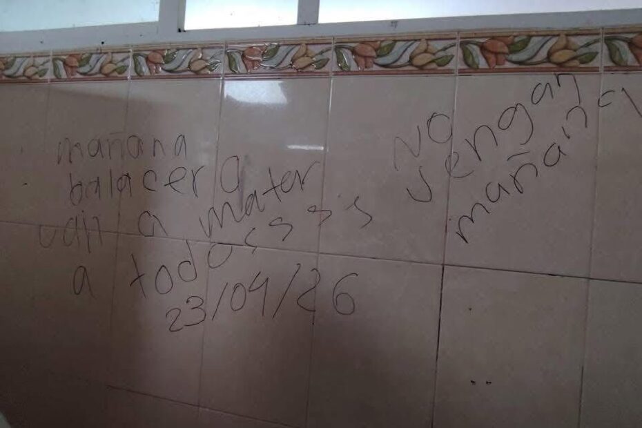 En el mensaje se lee “Mañana balacera van a matar a todos” “No vengan” y lo fechan 23 de abril de 2026.