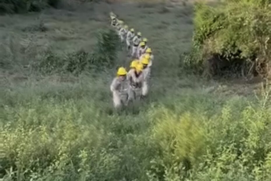 Se observa cómo los trabajadores, en fila india, jalan el poste de luz enmedio del campo para trasladarlo a donde se instalaría.