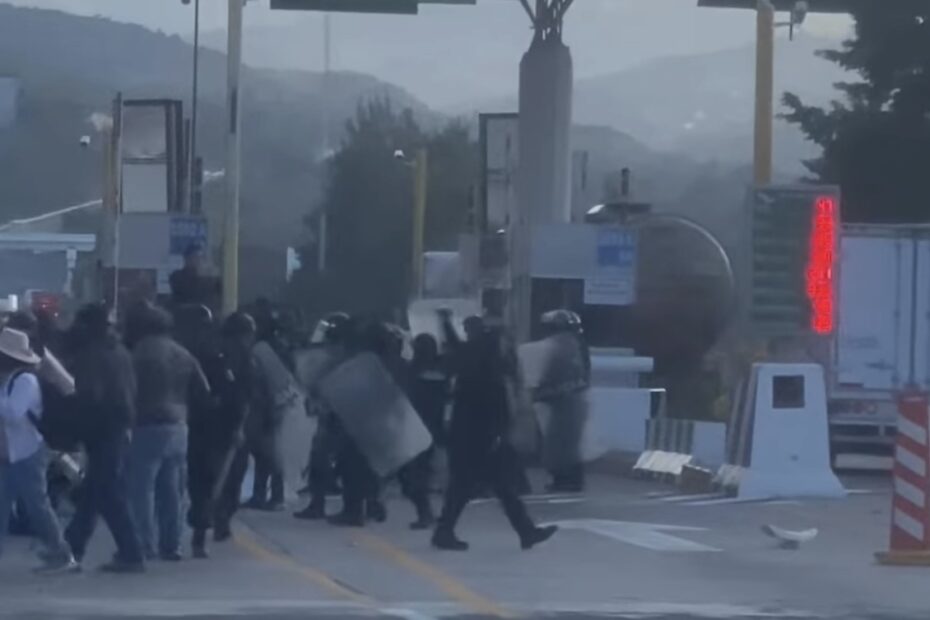 En el tercer día de protestas de habitantes de Guadalupe La Nata, perteneciente a San Miguel Tequitepec, elementos de la Policía Estatal desalojaron a los manifestantes por impedir el paso vehicular en esta caseta de cobro.
